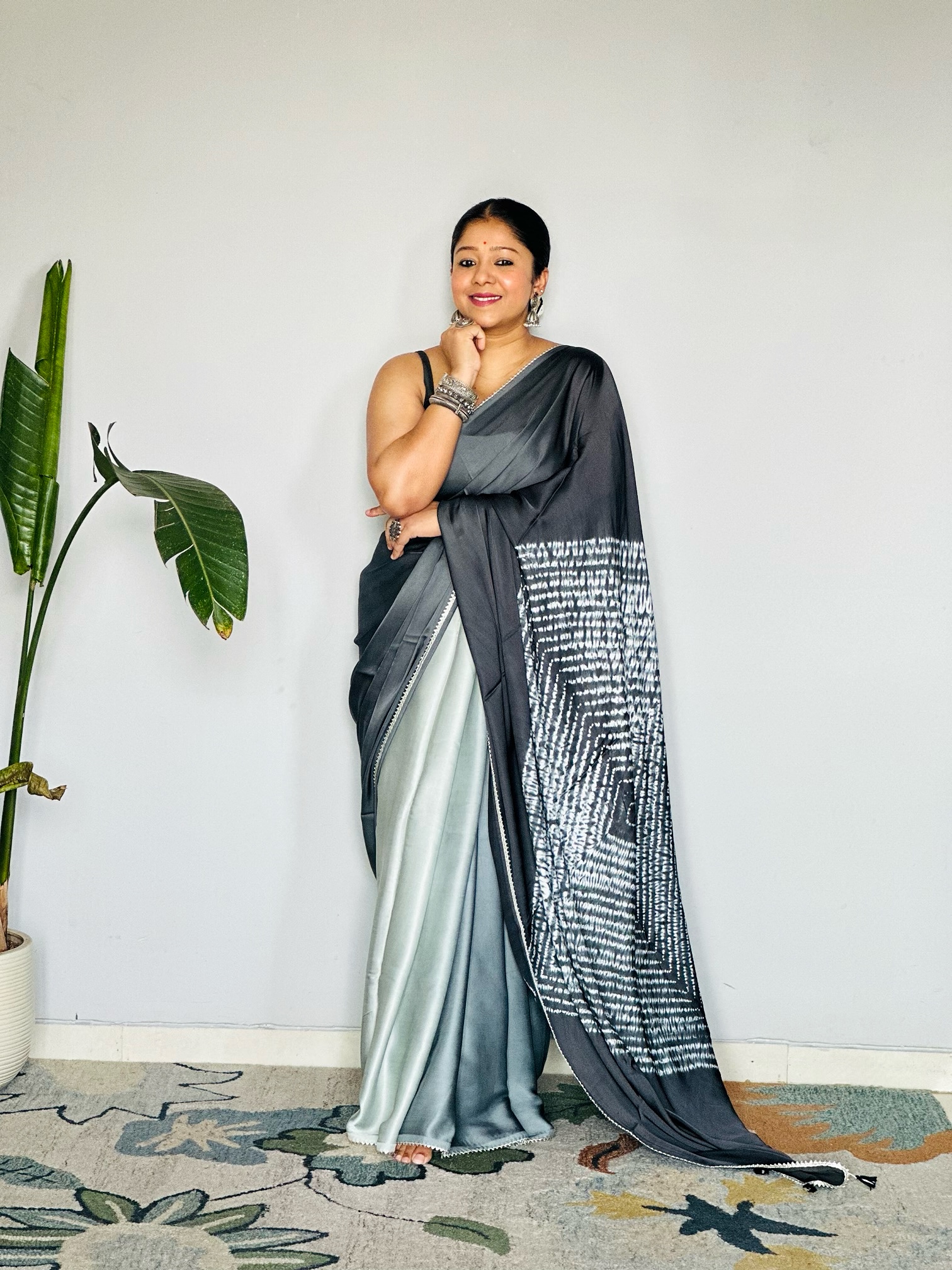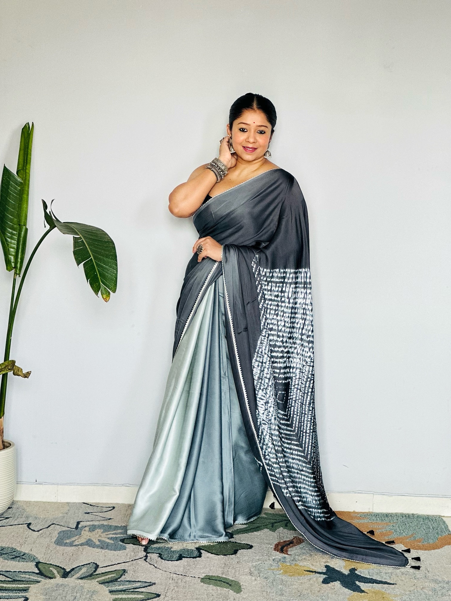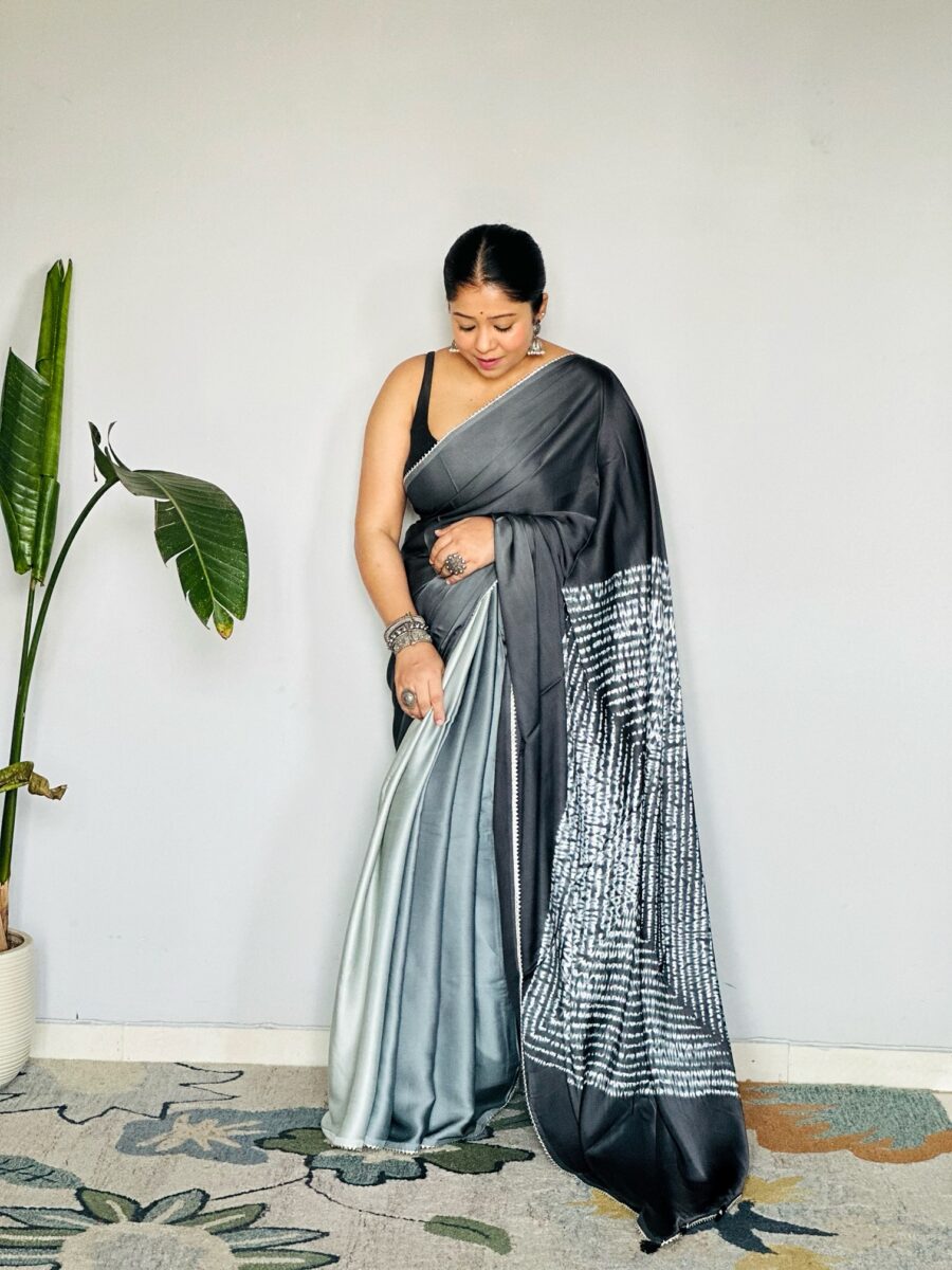 - The saree has shades of grey.