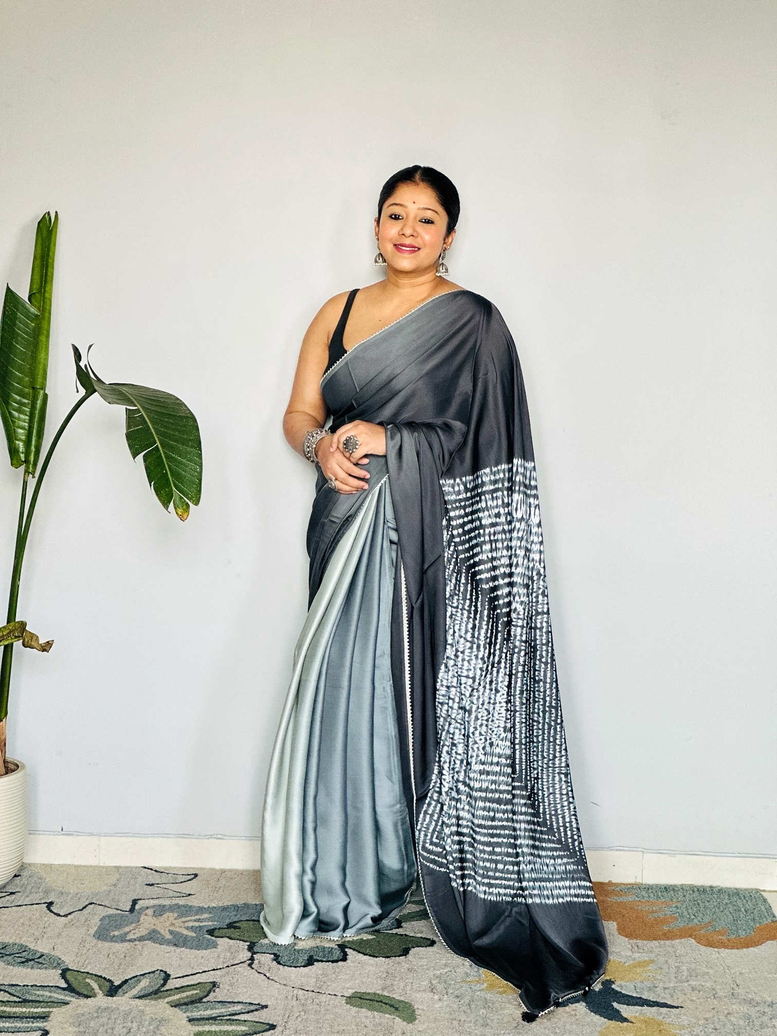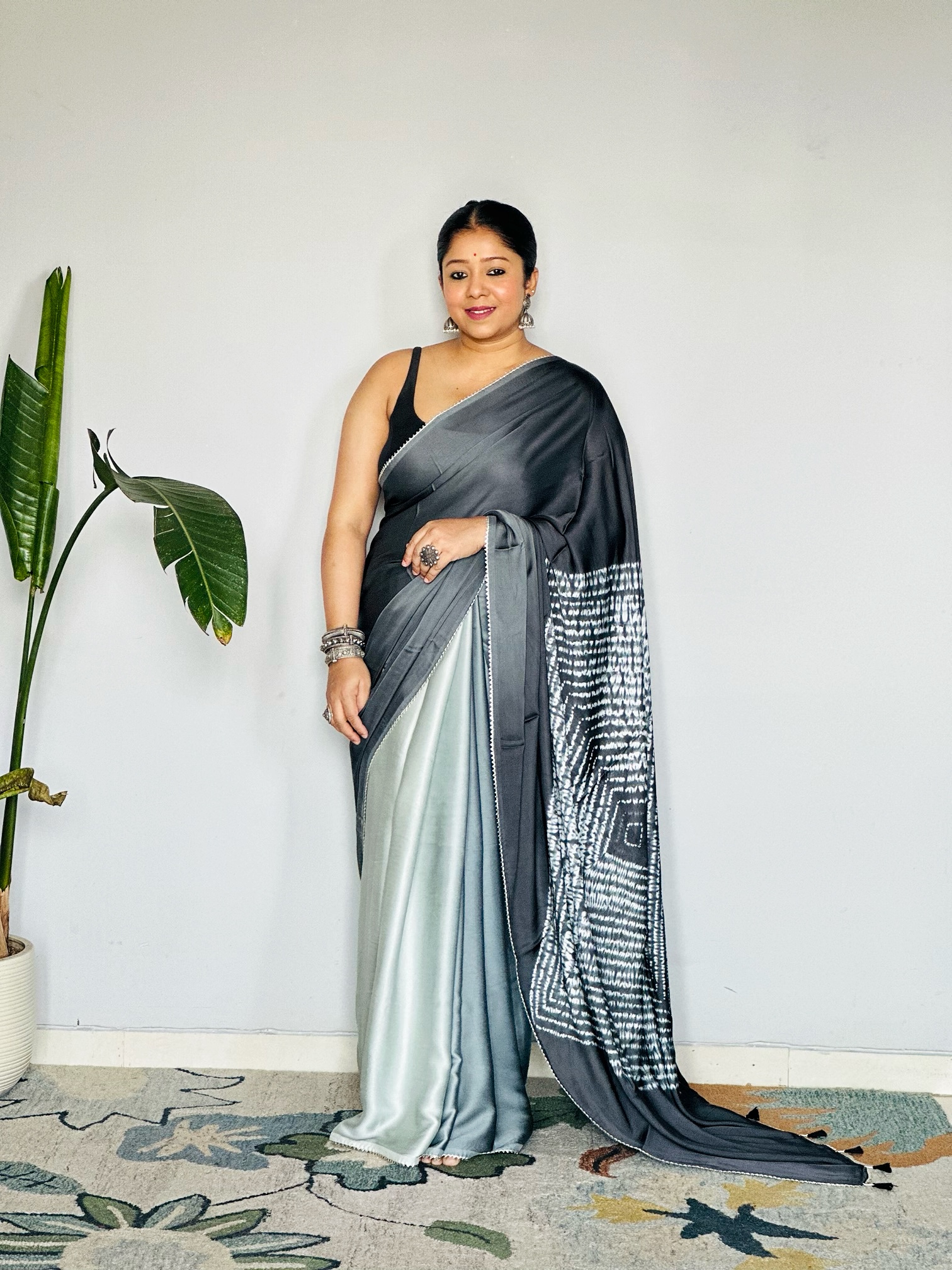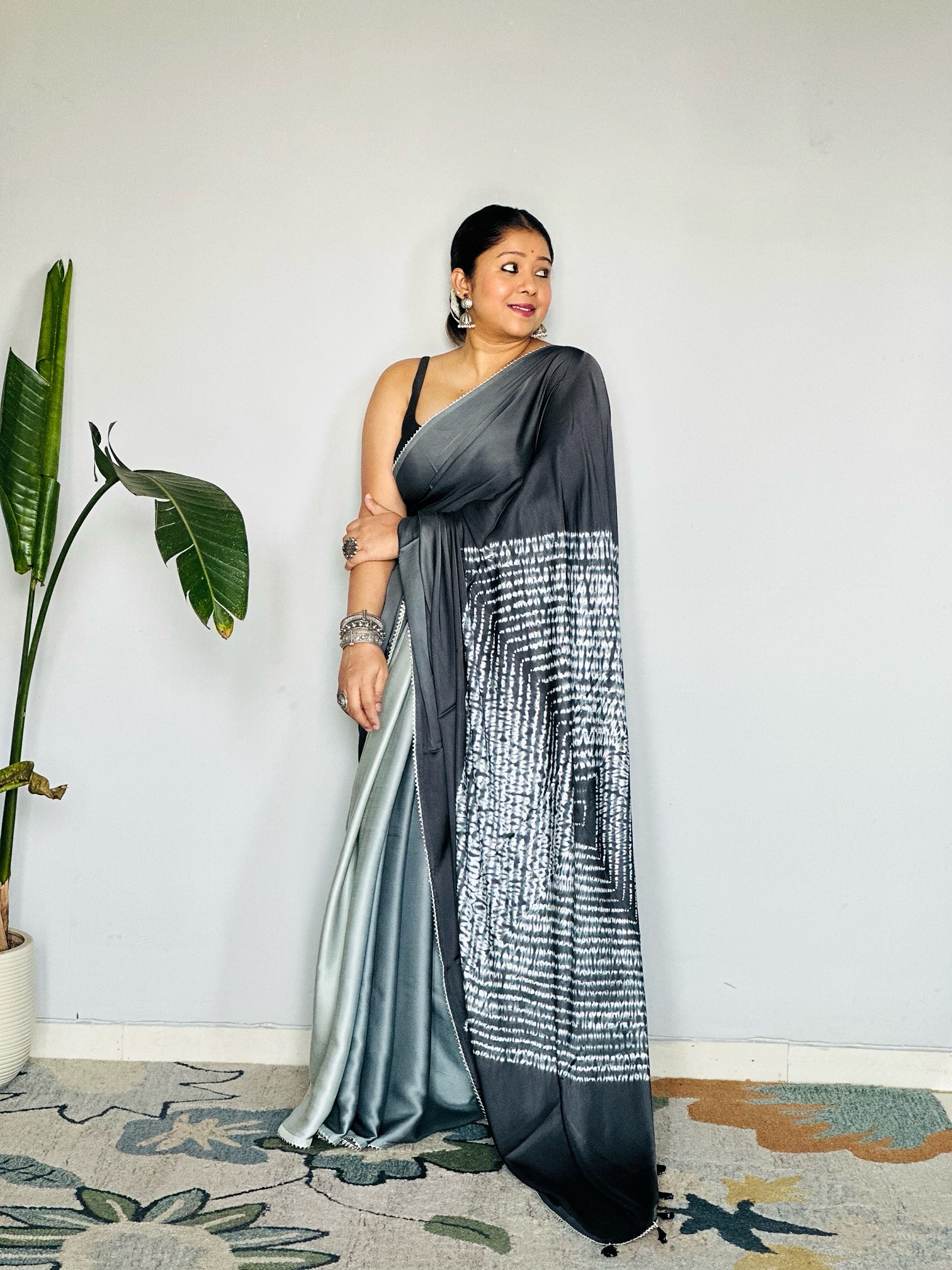 - The saree has shades of grey.